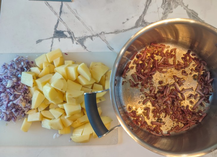 • 100 grams chopped bacon, speck, or smoked pancetta (about 1 cup when raw and loosely placed in a 1-cup measuring cup)