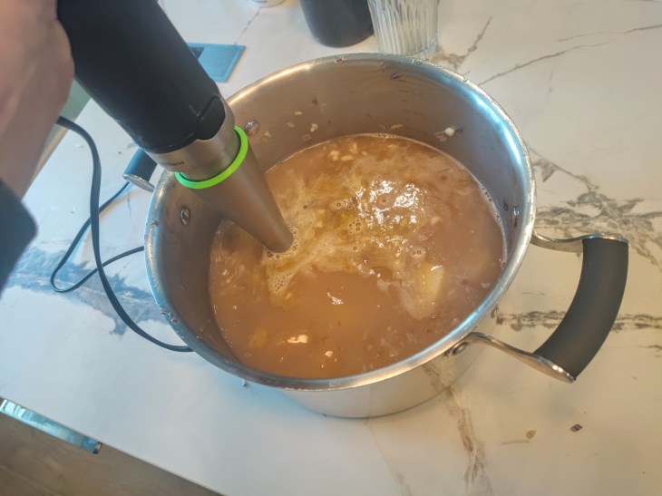3. Raising the heat to high, add the stock to the pot with the potatoes and onions and bring it to a boil. Once the stock is boiling, reduce the heat and simmer for 10-15 minutes or until the potatoes are tender (if the tip if a knife pierces and goes through a potato, they are ready). Use an immersion blender to finely blend all the pan ingredients until you reach a creamy consistency. Alternatively, transfer all ingredients to a regular blender or leak-proof food processor and blend