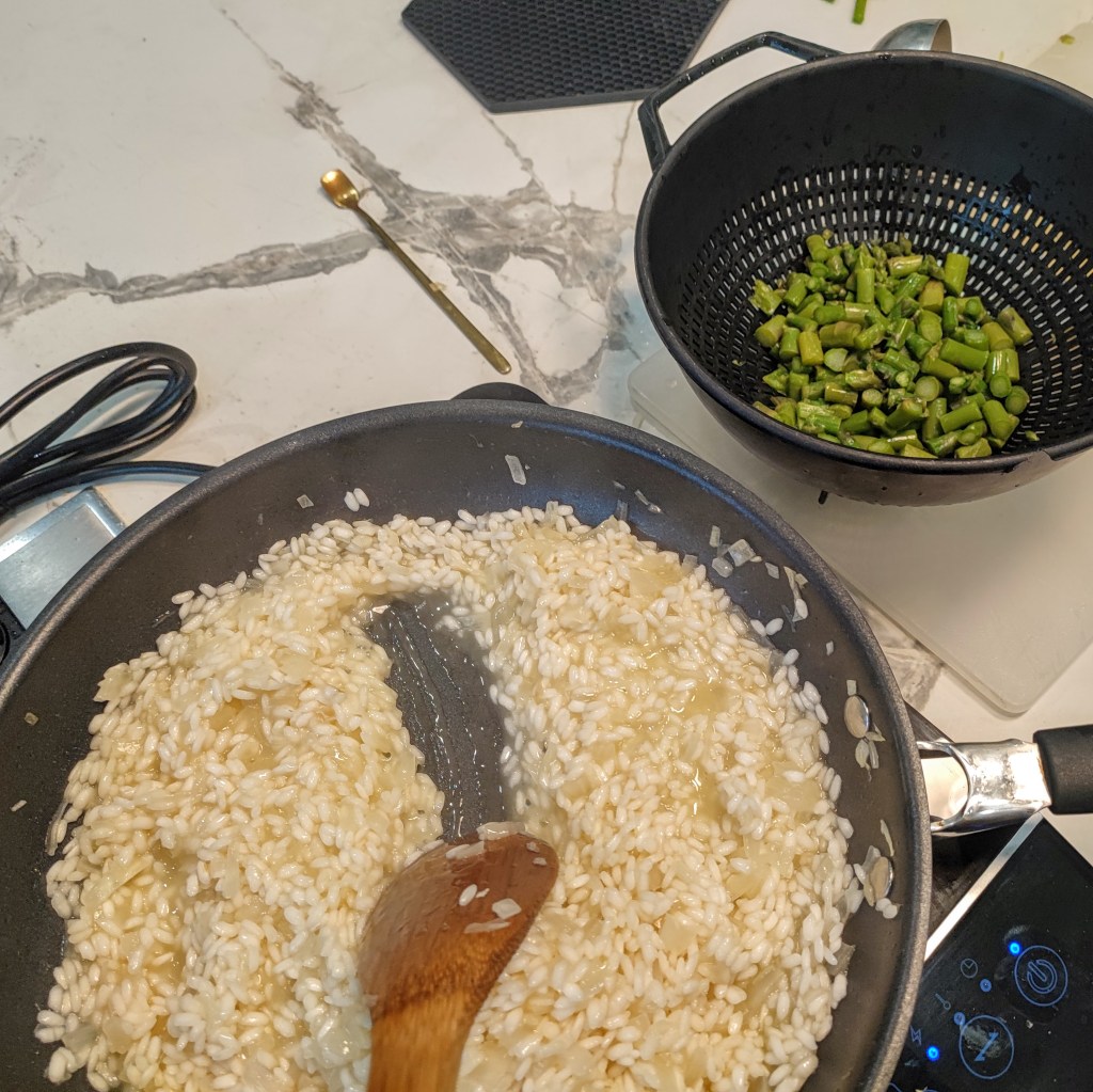 - Add one ladle (about a 3/4 cup) of broth at a time to the rice and simmer and stir until the broth is nearly evaporated (See the headnote photo. Using a wooden spoon, make a path in the risotto. The path should stay in place for a few seconds. That’s when you know to add more broth). NOTE: Adding the broth a little at a time allows the rice to slowly release its starch, which makes it creamy. If you put all the broth in at once the rice reacts differently and you won’t have a nice, creamy risotto. Continue to add the broth a ladle at a time until you have used all of it. This process should take about 30 – 40 minutes. Taste a few grains of rice for doneness. Continue simmering and stirring until the rice is creamy, not watery. Mix in the chopped asparagus and lemon juice (if adding) when you have used up the majority of the broth