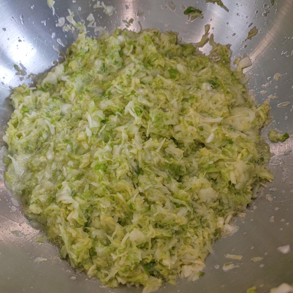 - Remove any loose outer leaves of the cabbage and discard. Cut the cabbage in half and remove and discard the core. Using a sharp knife or a food processor with a slicing disc, slice the cabbage VERY finely and place it into a large mixing bowl