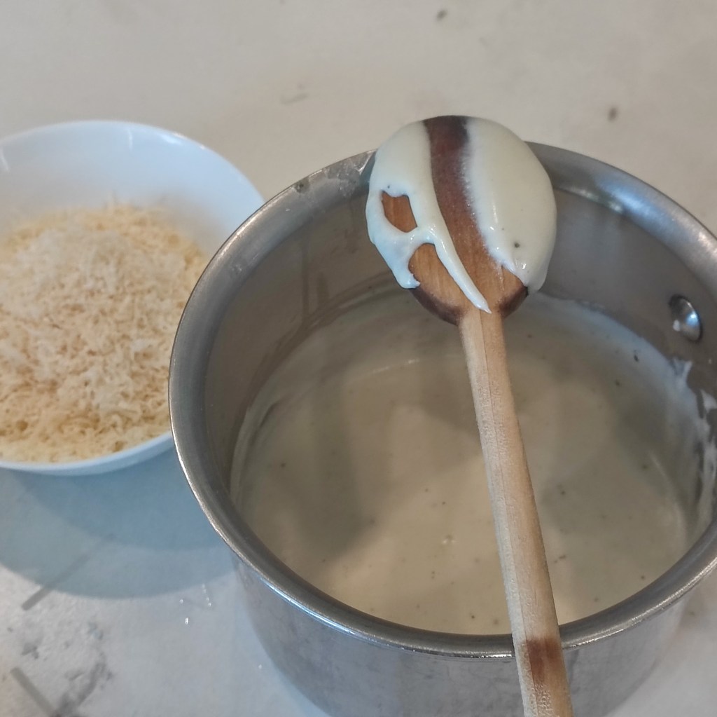 Parmesan cream sounds like the stuff of dreams — and it is (or can be)! In its essence, Parmesan cream is a bechamel (white) sauce loaded with Parmesan. In fact, it’s the base of my Adult Mac & Cheese. However, I thought what if I “densified” (my made-up verb to make denser) the cream sauce into a paste? In this way it is also useful for a: