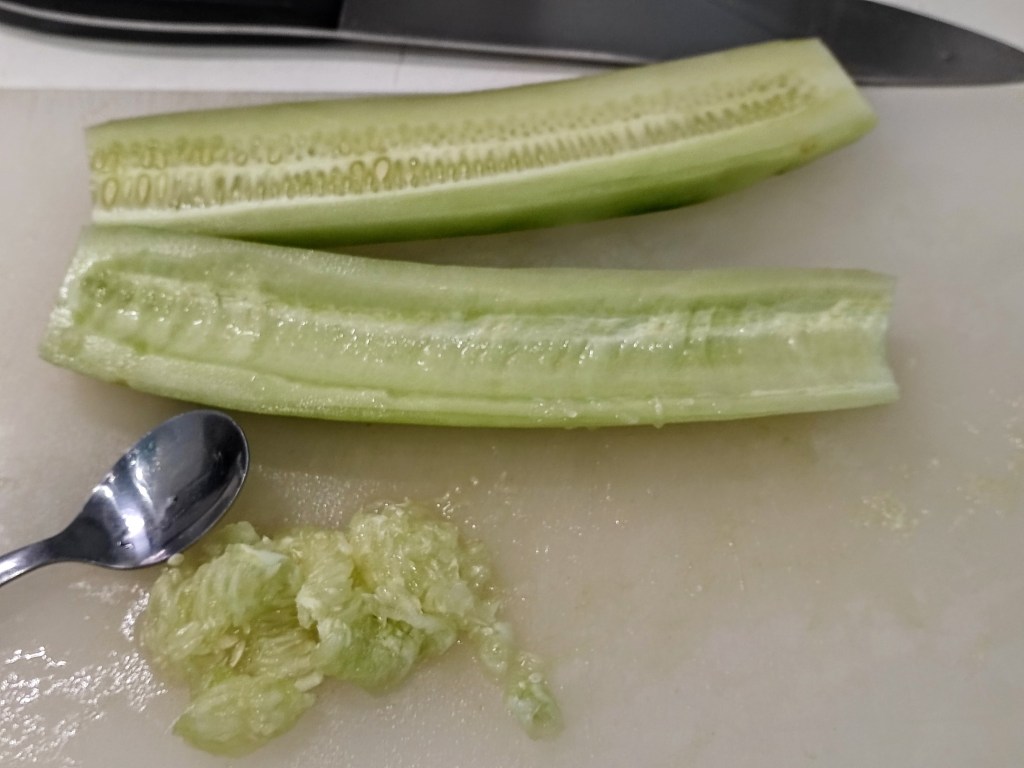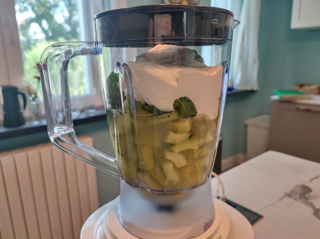- Peel – or don’t peel, the choice is yours – the cucumbers and cut them in half vertically. Using a small spoon, scrape out and discard the seeds. Roughly chop three of the cucumbers and place them into a blender. Dice the remaining two cucumbers to use as garnish and set them aside. NOTE: If you peel your cucumbers, the soup will be ever-so-slightly pale green. If you leave the peels on, the soup will be much more noticeably green. However, many grocery stores wax their cucumbers and that, along with the peel itself is difficult to digest. I peel mine, but the choice is yours
