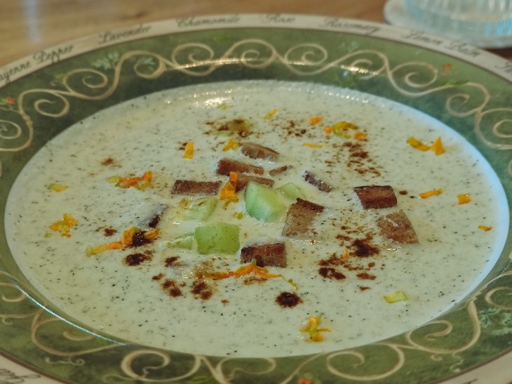 - Divide the soup into bowls and garnish with the rye bread croutons, diced cucumber, minced edible flowers (if using) and a sprinkle of raw licorice powder (e.g. Lakrids brand) or ground anise seeds and serve
