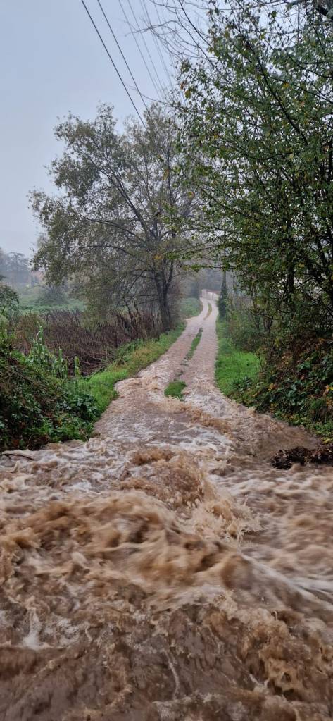The Great Flood of 2025: Tom and I thoroughly cleaned the ditches from branches and leaves, I swear! What we could not account for were neighboring houses and fields uphill that don’t take care of theirs. Sixty cm (about 2 feet) of rain fell in a period of six hours. The ditches couldn’t handle the amount and speed of the water, and they overflowed. The main County-owned ditch broke like a dam and rushed down our dirt road taking with it all the gravel and leaving huge, eroded potholes, rendering the road un-drivable. One of the culprits that caused the overflow was a huge tree stump filled with nails floating downstream from who knows where and it clogged the main drain. Grrr… People throwing debris into the ditches should be prosecuted! This most definitely includes contractors throwing home renovation materials into ditches instead of disposing of them properly.