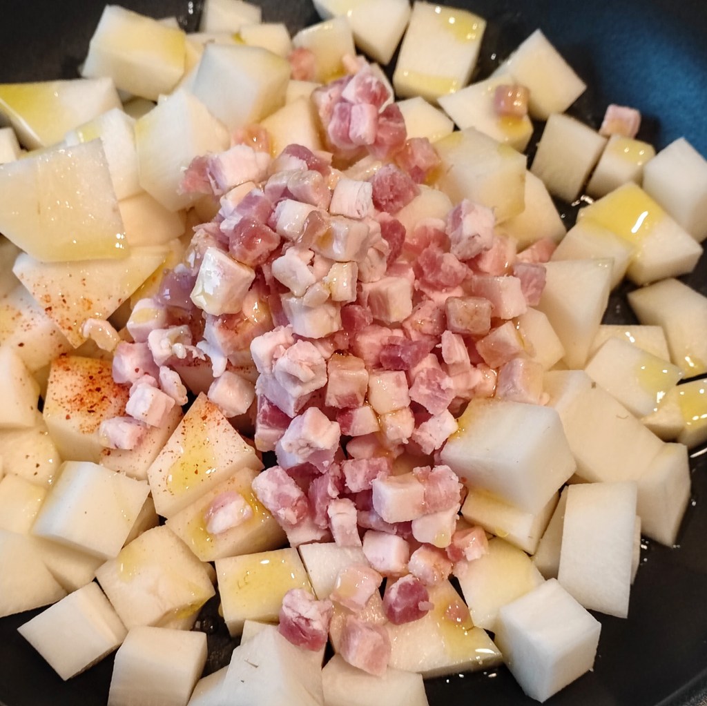 - Place the diced chayote into a large sauté pan along with the pancetta, olive oil and salt. Toss to combine and set the heat to medium-low. Continue to heat, stirring occasionally until the chayote can be easily pierced with a knife and begins browning. Taste a piece to determine which texture you would like. I cook mine thoroughly until they are soft. Some people like them while they are still a bit crunchy, somewhat like jicama. Add the minced garlic in the last 2 minutes of sauteing and stir continuously. Taste and add more salt if needed