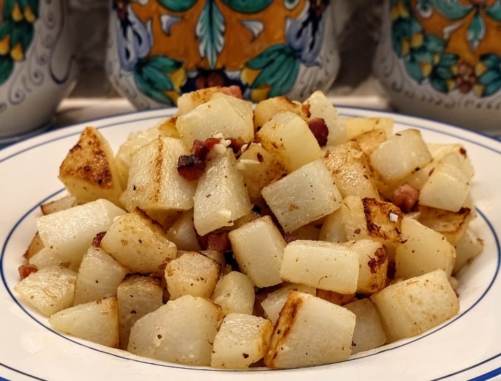Technically a fruit (like tomatoes and zucchini), chayote is mostly treated like firm squash. The beauty of them is that they readily take on any flavor that’s cooked with them. In today’s recipe I chose pancetta (any smoked pork product will do) and garlic. If you’re vegetarian skip the pork and add a teaspoon of smoked paprika, instead. Sautéed or roasted, chayote comes out like potatoes. In fact, I told my notoriously finicky eater brother-in-law who shies away from vegetables that they were potatoes. The joke was on him when he asked for a second helping, and that’s when I told him the truth. Did he like the squash, or the pancetta? Who’s to say, but I got him to eat more vegetables!