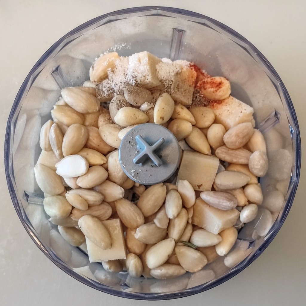 - Place the chopped Parmesan, nuts, garlic, herbs, salt, pepper and ground chili flakes in the bowl of a food processor. Process until you reach a fine, sandy texture. Alternatively, you may use a mortar and pestle to crush all these ingredients into a paste