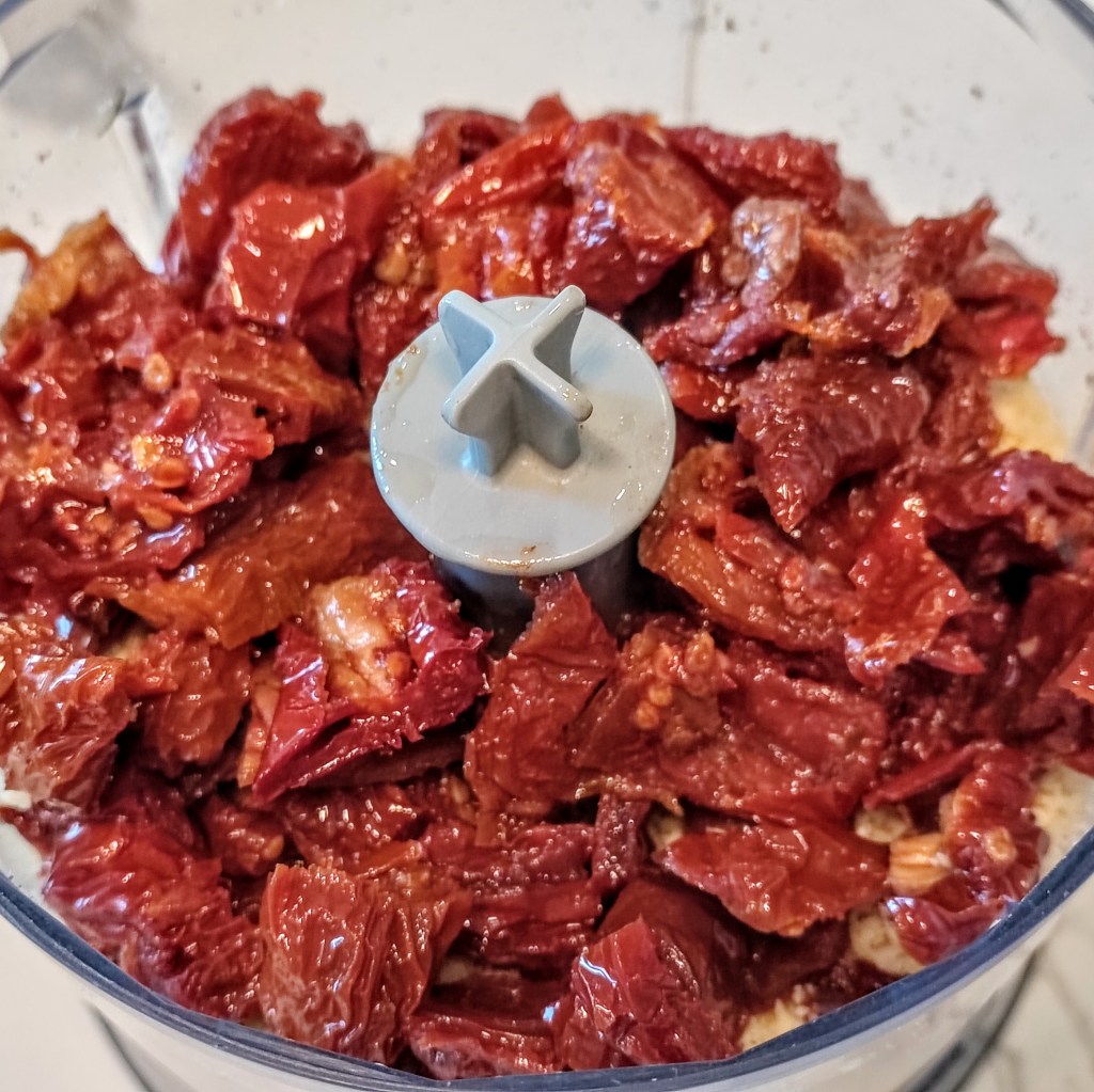 - Add the chopped sun-dried tomatoes to the food processor bowl and process. Note: You may need to scrape down the bowl several times to get the tomatoes to fully incorporate into the nut and cheese mixture