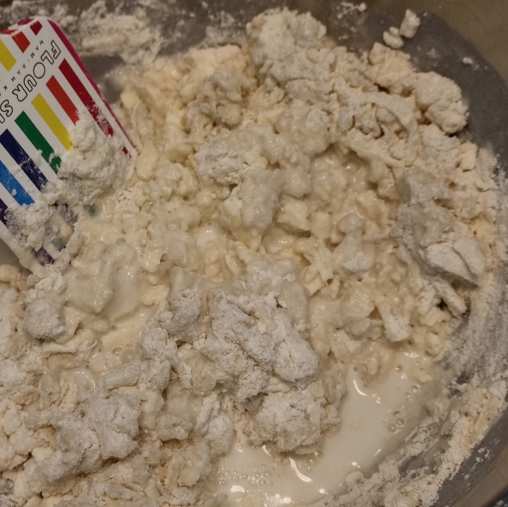 - In batches, pour and fold the milk into the bowl with the flour mixture until it forms a shaggy dough