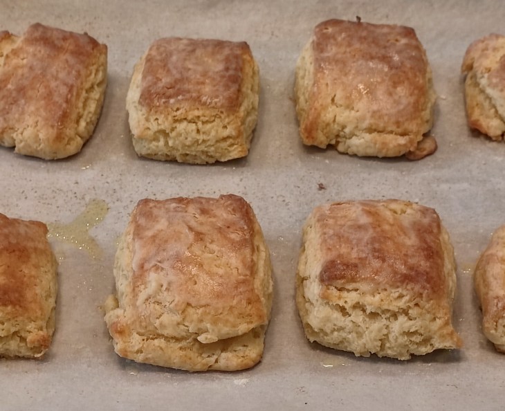 - Cut the final 8 x 5-inch rectangle into 8 equal rectangles and place them on a baking sheet lined with parchment paper. CHOICES: Do you want soft edges on your biscuits? If so, place them very close to each other on the baking sheet. Do you want crispy edges on your biscuits? If so, place them a couple of inches apart on the baking sheet to allow the heat to surround them while baking. Eat these while still warm. That said, they freeze well once fully cooled. Simply place them in an airtight freezer bag and they’ll keep for several weeks. These are so good you’ll want to exclaim, “Fry me in butter and call me a catfish!”