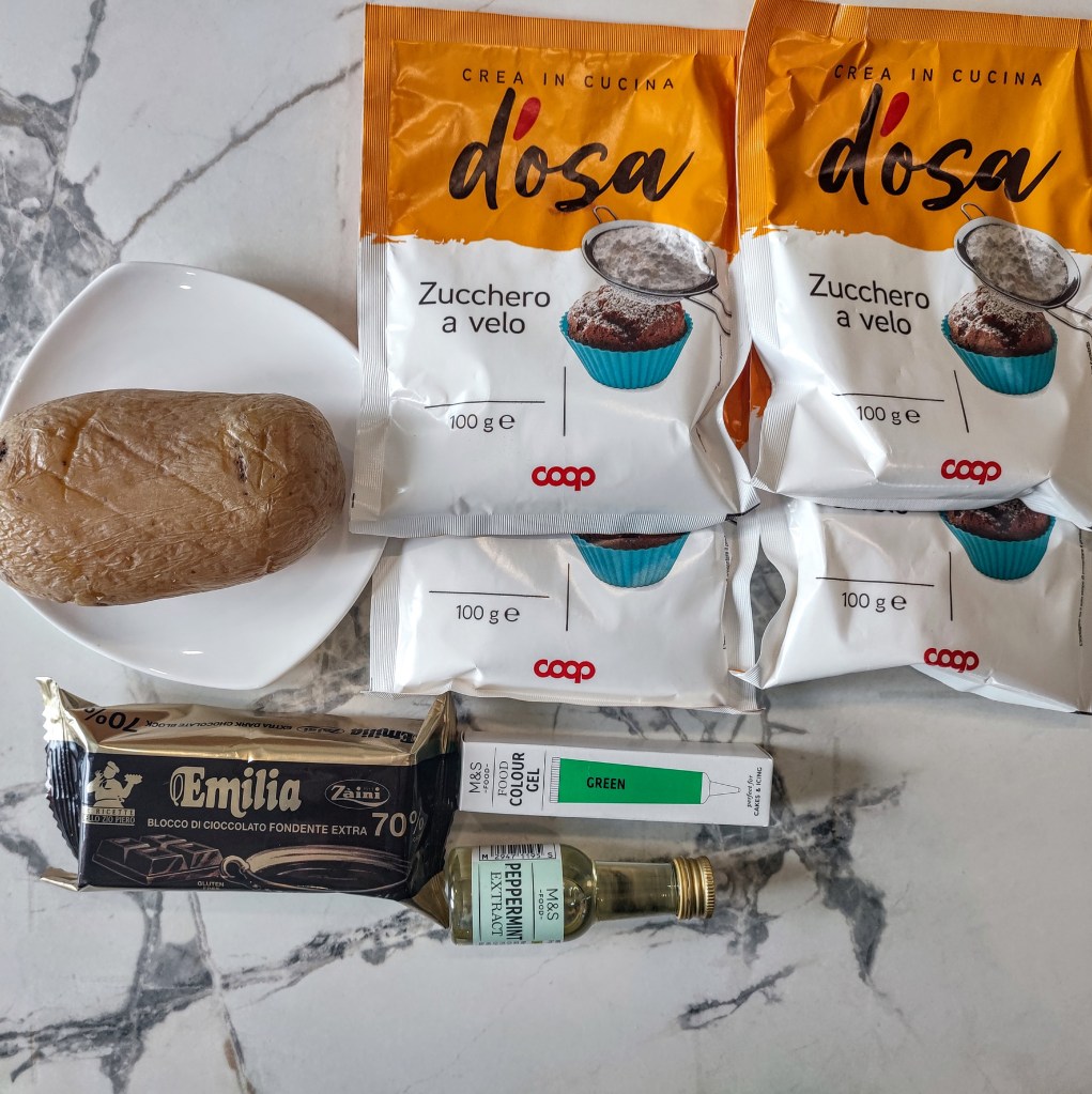 - Add 400 grams (3 + 1/2 cups) of powdered sugar, 1/4 teaspoon peppermint extract, and a few drops of green food color. Mix until it all comes together as a ball. This will take a while — be patient if at first it looks dry. After being patient and mixing for a good long while, add 1 teaspoon of water if it’s just not coming together. Repeat if needed. Ultimately, this ought to have the consistency of pastry dough. If you accidentally add too much water and it’s too wet, just add more powdered sugar. Check for your desired color and add more food color as needed