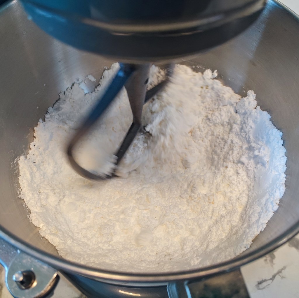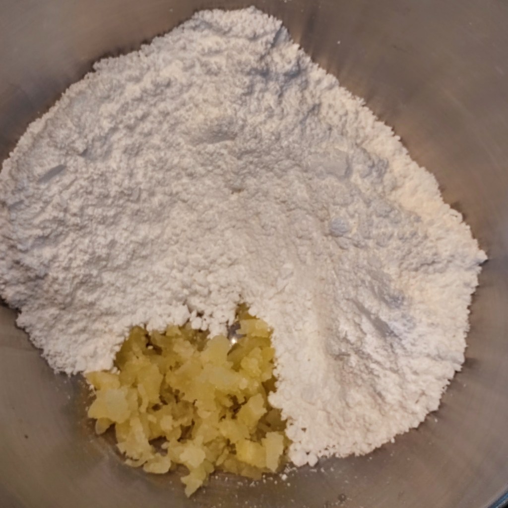- Prick with a knife or fork then bake a potato at 400F (200C) for approximately 45 – 60 minutes, or until a knife can very easily pierce all the way through it. Let it cool enough to be able to handle it, then remove the peel. If you have a potato ricer, rice the potato into a bowl. If you do not have a ricer, that’s fine, just mash it thoroughly with a fork ensuring that no lumps are present and that the potato mash has a smooth finish. DO NOT use a food processor, which makes the starch in the potato gummy. Weigh 50 grams (or 1/3 cup) of the potato and place it in the bowl of a stand mixer with the paddle attachment (or in a bowl to beat with a handheld electric beater). If you have leftover baked potato mash eat it later as a snack!