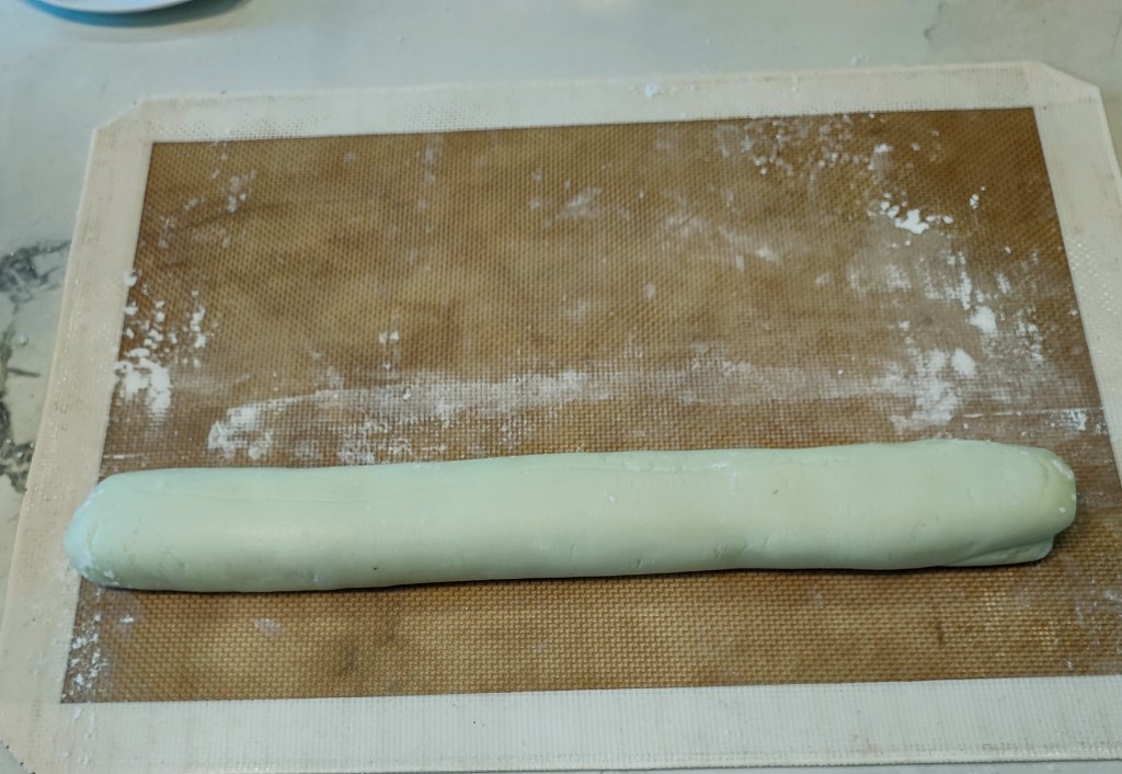 - Transfer the “dough” to a silicone mat or parchment baking paper and press and roll together to form a log of about 1.5 inches (3.5 cm) diameter. If it is too sticky, add some powdered sugar to the mat or paper. Keep the log rolled in a silpat mat or parchment paper and transfer it to the refrigerator for 60 minutes. Remove the log from the refrigerator and cut it into equal discs. Using a cookie cutter or any small circular form, swirl the discs around to even out your discs to make neat circles (this is optional). Place the circles back in the refrigerator while you melt the chocolate (the next step)