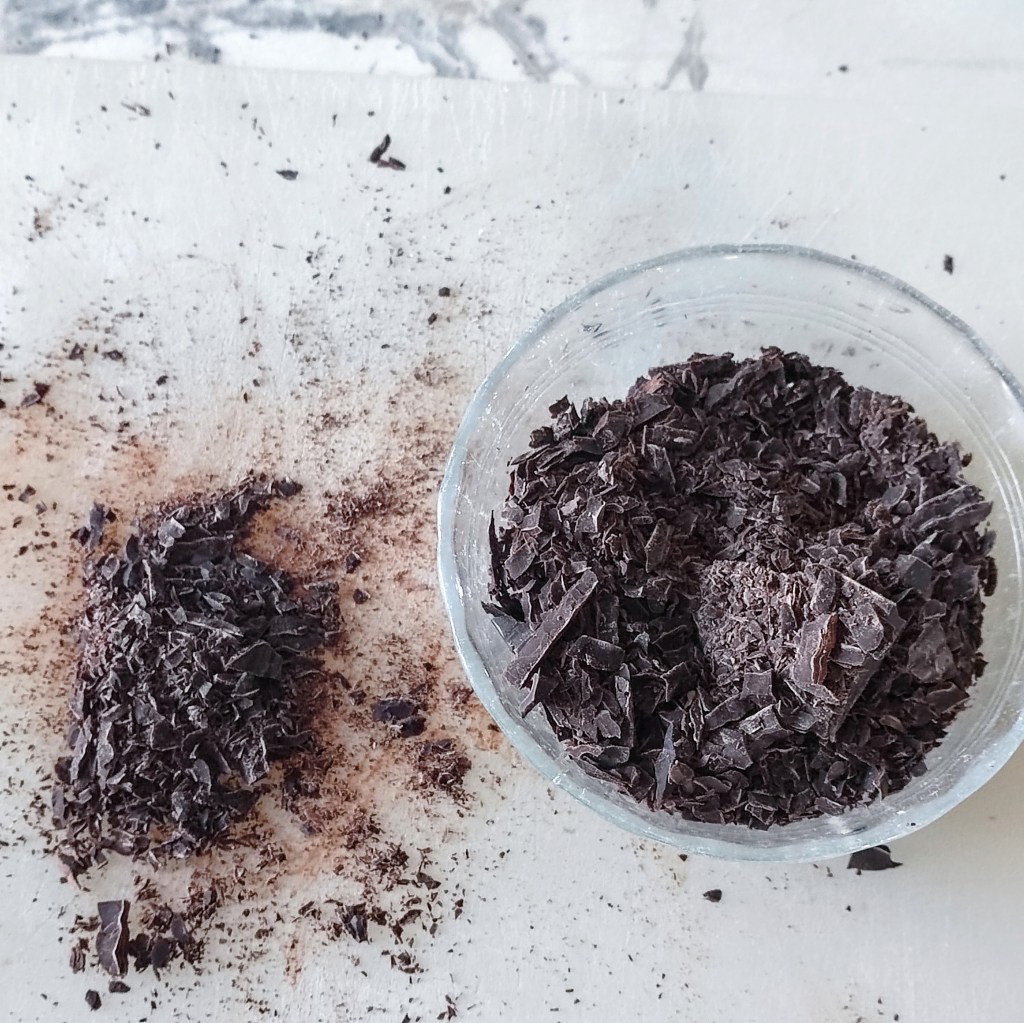 - Using a serrated knife, cut the chocolate into small pieces. Reserving a small handful, place most of the chocolate into a microwavable bowl and microwave in 20-second increments until it is “almost” melted. The residual heat from the bowl will melt the rest of it once stirred. (NOTE: you may also use a Bain Marie/double broiler to melt the chocolate if you prefer). Off the heat, add the small amount of un-melted chocolate that you had set aside to the bowl with the melted chocolate and stir until it is fully incorporated, melted, and glossy. NOTE: Adding the un-melted chocolate “seeds” and “tempers” the chocolate. What this means: Chocolate is finicky and can “bloom” (turn grayish) if not tempered correctly. There are two ways to temper chocolate. This recipe uses a very easy method, called “seeding” by adding some un-melted chocolate to the melted chocolate to give it back its chemical structure. The un-melted chocolate acts as “seeds” helping it grow back its original structure and color. The other tempering method is complex and deals with raising and lowering the temperature of the chocolate to very precise degrees. I don’t want to do that, and I trust you don’t either. Just add some un-melted chocolate to the melted chocolate and you’ll be fine.
