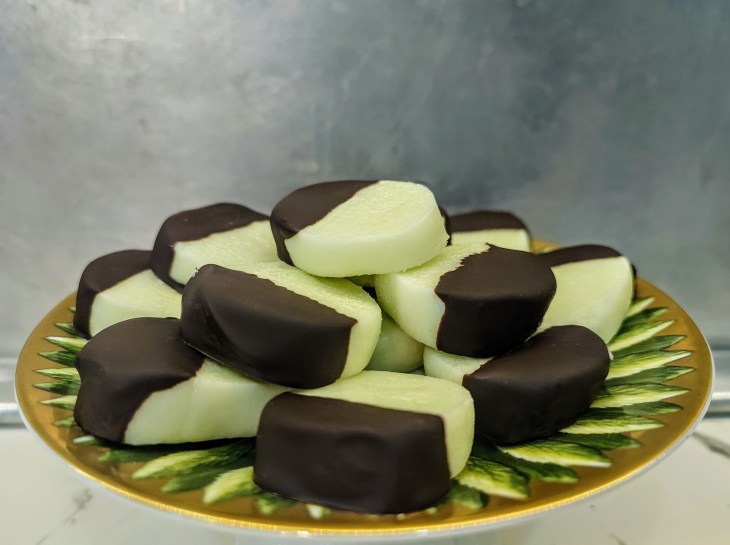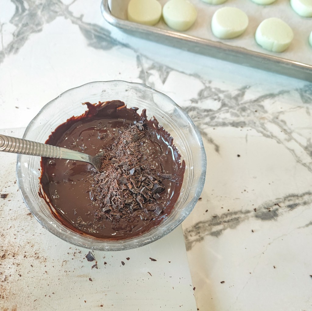 - Gently, because they are a bit fragile, take each peppermint cream disk and dip half into the chocolate then place it back onto the silpat mat or parchment paper and place it into the refrigerator until set (about 30 minutes). These may be brought out to room temperature to serve or eaten chilled