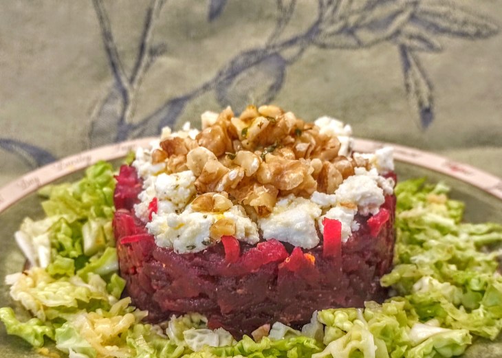 - On top of an individual serving plate, using a circular cookie cutter or similar tool, put 1/4 of the beet mixture into the circular form and pat it down with a spoon or fork. Add a spoonful of the feta mixture on top of the beets, followed by the walnuts. Add a drizzle of the vinaigrette on top of the walnuts and slowly and gently remove the circular form. Repeat this process with the other servings