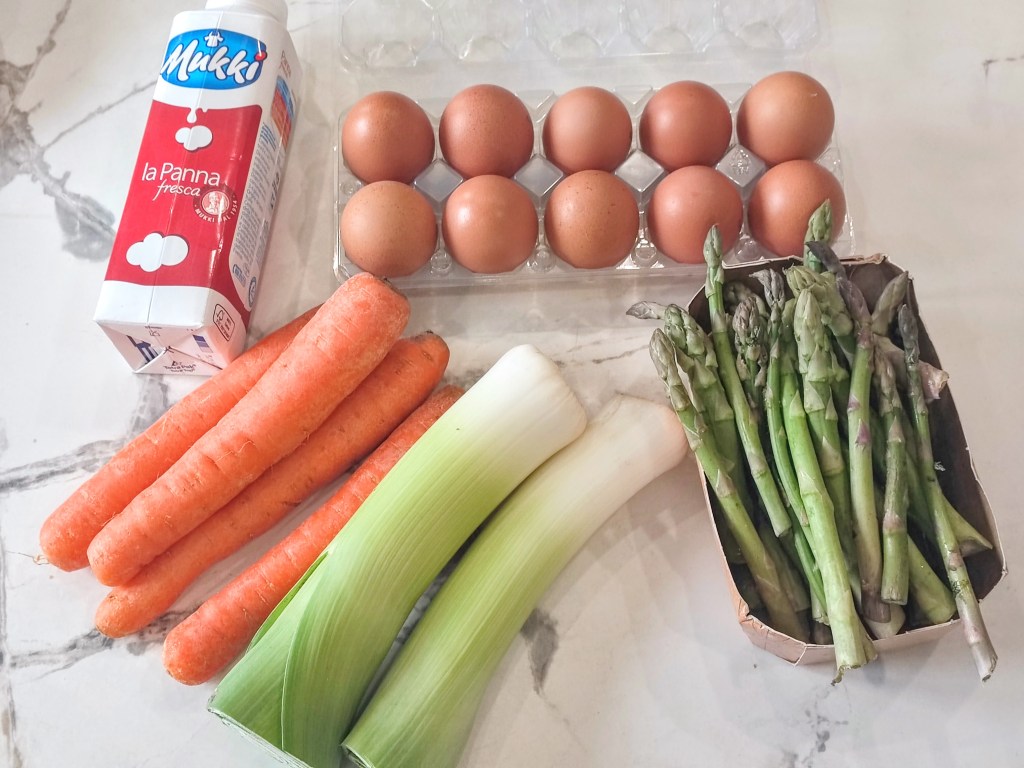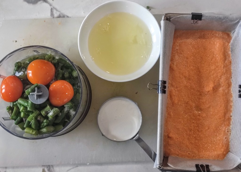 - In a freshly cleaned food processor, add the asparagus, 2 eggs and an egg yolk. (Save the egg white for another future need.) Whizz the food processor until the asparagus is completely smooth. Add 1/2-cup cream and whizz again with 1/2 teaspoon of salt and 1/4 teaspoon of ground black pepper until it is fully blended. If you’re not wary of raw egg, taste for seasoning and add more salt or pepper as desired. So as not to disturb the carrot layer, very gently spoon and spread the asparagus mixture on top of the carrot mixture