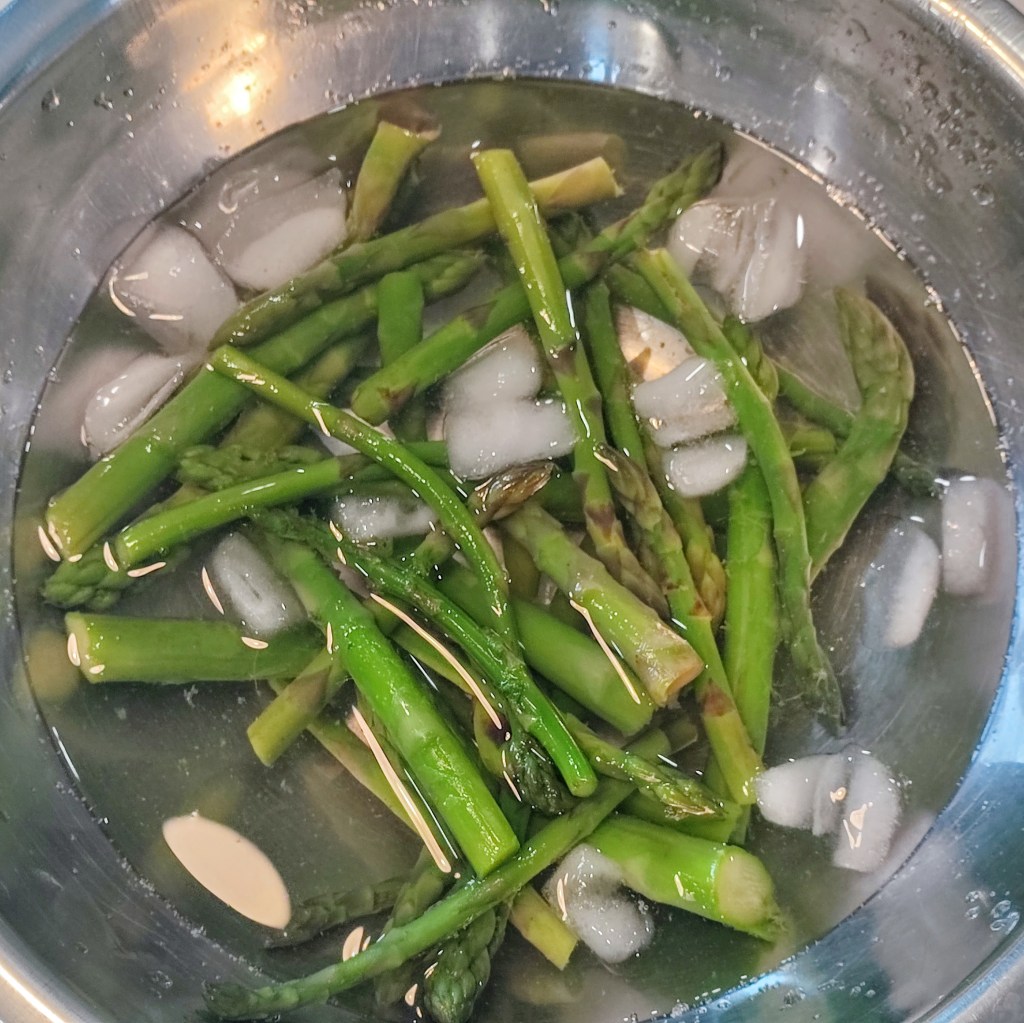 - In a large pot, boil the asparagus for 4 minutes. Set a timer! Remove the spears and place them in an ice water bath until they are completely cooled. Remove the spears and place them on a clean dish towel to let them completely dry