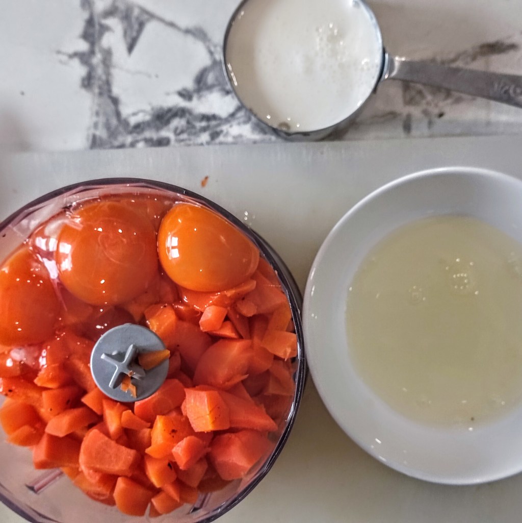 - In a food processor, add the carrots, 2 eggs and an egg yolk. (Save the egg white for another future need.) Whizz the food processor until the carrots are completely smooth. Add 1/2-cup cream and whizz again with 1/2 teaspoon of salt and 1/4 teaspoon of ground black pepper until it is fully blended. If you’re not wary of raw egg, taste for seasoning and add more salt or pepper as desired. Spread the carrot mixture evenly in the bottom of the prepared loaf pan