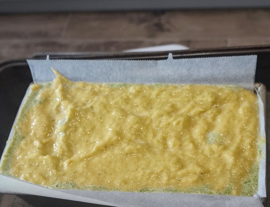 - Prepare a loaf pan with vegetable oil spray and line it with a parchment paper sling